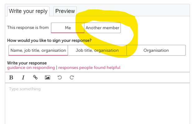 Step 2: Above the response text box it says "This response is from", with a box next to it that says "me". Next to this is a box that says "Another member".