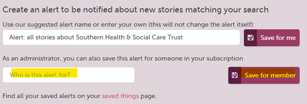 You set up an alert for another member the same way you would for yourself. Once you have defined the scope of the alert using the search function, you choose Create alert but type the name of the person you wish to set it up for, then click Save for member
