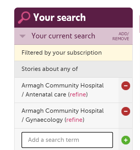 - On the search page use the pink refine button on the left hand side to drill down to the specific services you need alerts for. click the green plus symbol to select then click "update my search" to apply this filter. NOTE: make sure this is done correctly. The search box will look like this and should say stories about any of and then list the services: