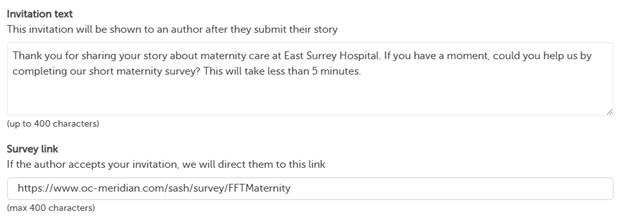 In the example below we have entered some invitation text to be shown the the author, and set the link for the online survey we want the author to complete.