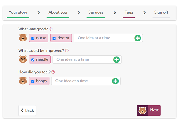 If you like, select a welcome message for people using your link. In addition, you can enter a "feedback focus" - any aspects of care you would like people to focus on in their story.