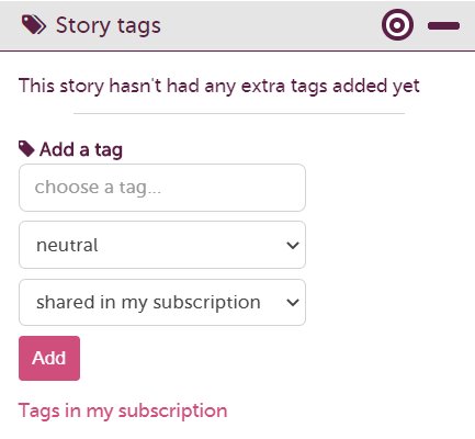 When looking at a story, navigate to 'Story tags' section in the drawer. You can now add your very own customised tag. Use the drop-down menu to select whether you would like it to be private, shared within your subscription or public. You can also categorise using polarity which will only be visible to you or members of your subscription.