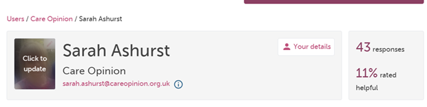 It is important to keep your profile details up to date, especially if you are a responder on Care Opinion Canada. The signature you sign your response with is pulled from the details in your profile.